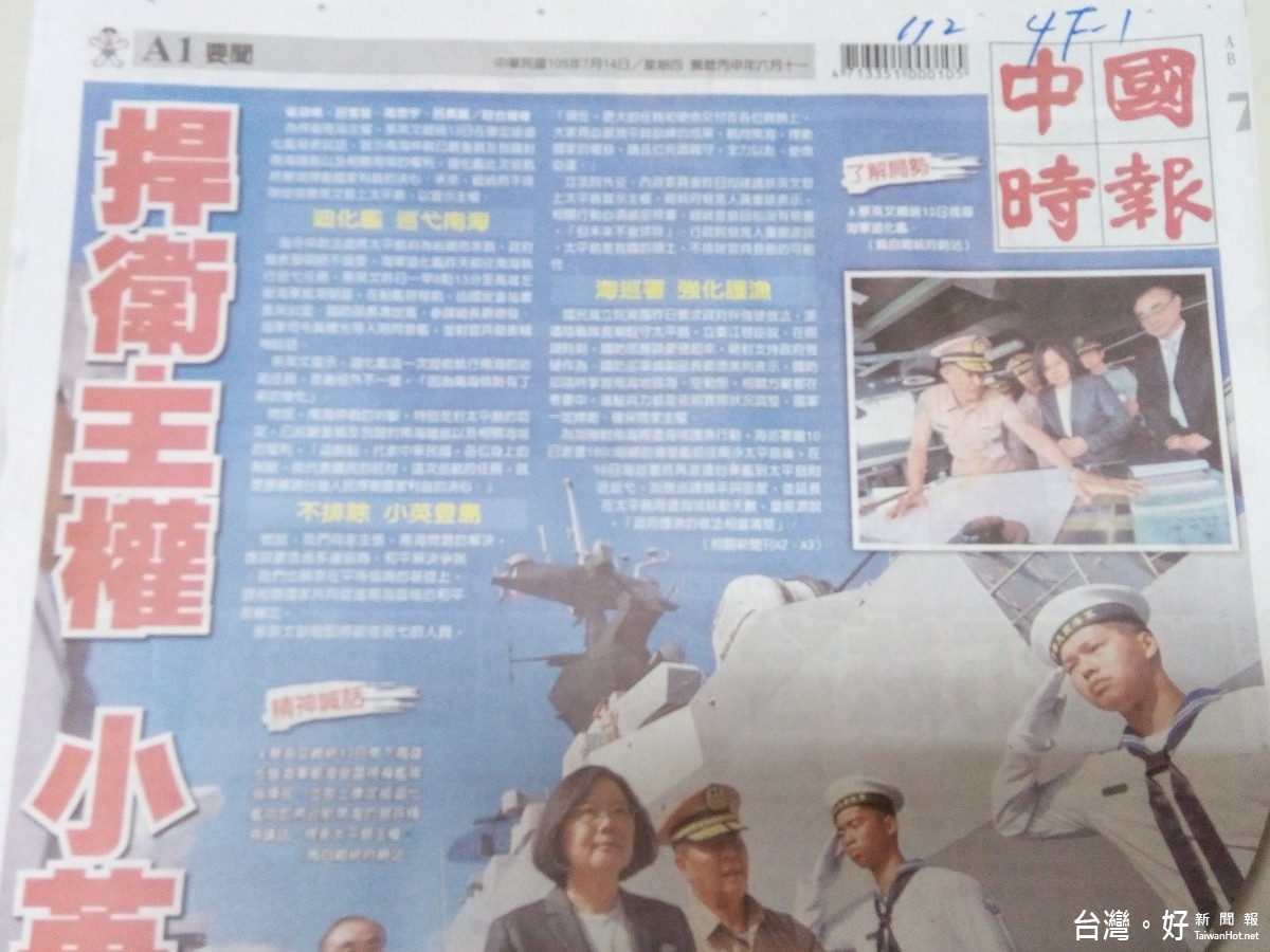 海牙仲裁法庭將太平島判為岩礁而非島,政府發表聲明絕不接受,海軍迪化艦昨天前往南海執行巡弋任務,蔡英文昨日一早8點13分至高雄左營海軍威海營區,在船艦啟程前,由國安會祕書長吳釗燮、國防部長馮世寬、參謀總長嚴德發、海軍司令黃曙光等人陪同登艦,並對官兵發表精神談話。