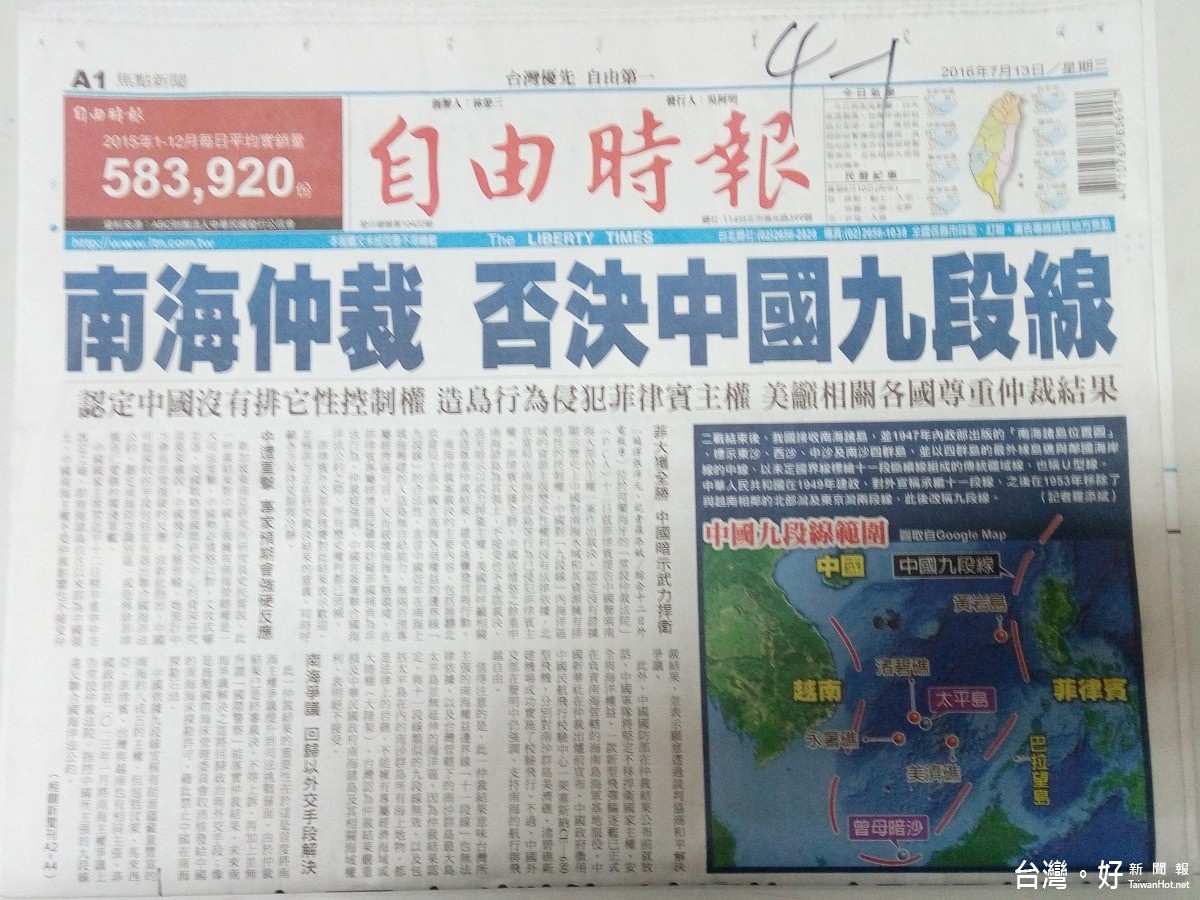 位於荷蘭海牙的「常設仲裁法院」(PCA)十二日就菲律賓提告中國聲索南海大部份主權一案作出裁決,認定沒有證據顯示歷史上中國對南海水域和其資源擁有排他性的控制權,中國對「九段線」內海洋區域的資源主張歷史性權利沒有法律依據,北京當局在南海的造島等行為已侵犯菲律賓主權,菲律賓大獲全勝。中國在憤怒之餘重申南海諸島為其領土,不接受也不承認裁決,甚至暗示以武力捍衛主權;美國則呼籲相關各造尊重仲裁結果,避免挑釁發言與行動。