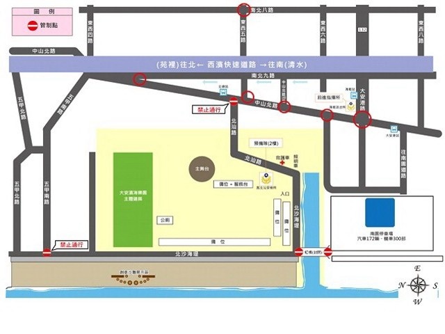 B路線:火車站→蔣公路與鎮政路口→光明路停車場→經國路與興安 路口→大安區公所→中山北路與中山橋→大安港站→北汕路。3、 C路線:原大安濱海樂園售票亭發車→中山北路→北汕路→ 北砂海堤車輛停放及臨時停車場規劃:(一)大安濱海樂園南園停車 場(含機車停車位)。(二)大安港路雙側路邊停車(中山北路及南 北八路間道路)。(三)南北九路單向路邊停車(東西四路及東西六 路間道路)。(四)北沙海堤路邊停車(五甲南路以北空地)。活動彈性管制時段是二十四日下午一時至九時。管制範圍:大安區北 沙海堤(五甲南路口至北汕路)。大安區北汕路(中山北路至北沙海堤)