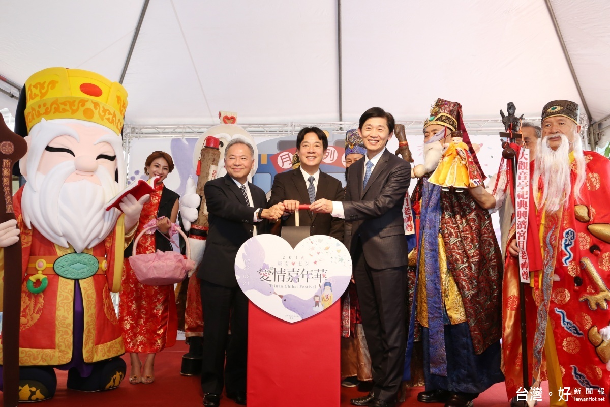 「2016臺南七夕愛情嘉年華」22日登場,今年活動連結廟宇、飯店、百貨、旅遊、藝文團體多達43單位,共規劃2檔展覽、10條精采豐富的文化走讀、4場套裝行程、8處裝置藝術及17場浪漫音樂饗宴,市長賴清德,去年臺南6大廟共湊合1016對婚緣,由臺南市的月老廟來「牽姻緣」,因應少子化的時代,孕育下一代,生產報國。