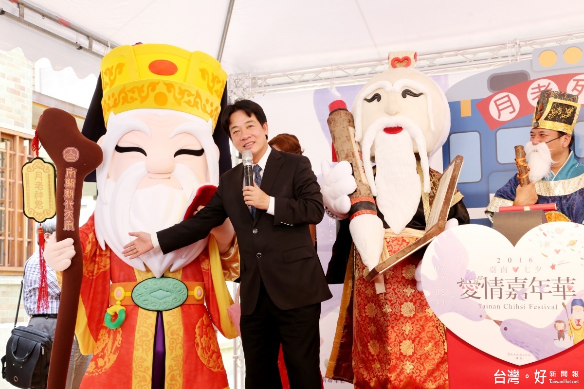今日記者會由市長賴清德與本市6家月老廟代表揭開序幕,包括大觀音亭、祀典武廟、祀典大天后宮、重慶寺、鹿耳門天后宮、南鯤鯓代天府等6座臺南廟宇所供奉的愛情神祇-月老的神偶扮相與賴市長同臺,共同啟動「2016臺南七夕愛情嘉年華」幸福列車,一同邀請國內、外遊客在熱情洋溢的盛夏來到臺南認識月老文化,感受臺南七夕的浪漫氛圍。