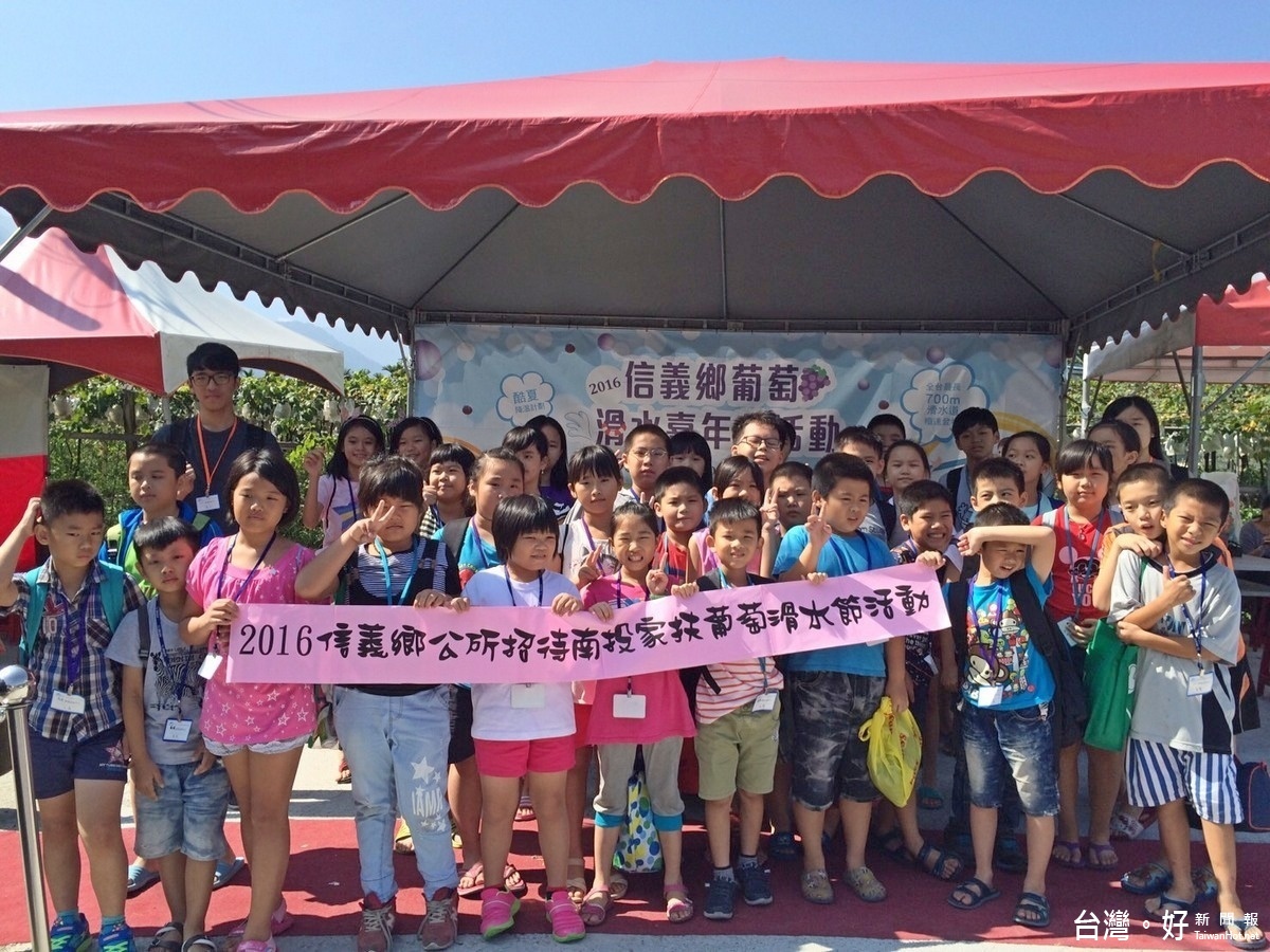 今年暑假各地區推出戲水活動,吸引不少遊客前往體驗,南投縣信義鄉為了推廣觀光產業,在暑假期間打造號稱全台最長700米滑水道,並結合當地盛產的農產品葡萄,特地舉辦「信義鄉葡萄節暨滑水嘉年華」。信義鄉公所26日招待南投家扶中心課輔班36位學童前往遊玩,除了刺激的滑水體驗外,還欣賞了沿路的田園美景。