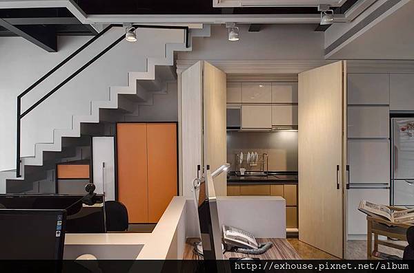 20坪的樓中樓空間,一樓兼具了辦公需求的使用,二樓才是客廳、臥房,利用