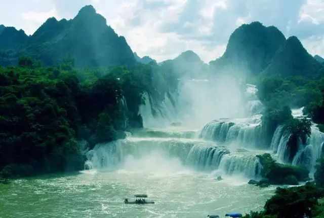 德天瀑布橫跨中國、越南兩個國家,是亞洲第一、世界第二大的跨國瀑布(瀑布寬200餘米,與越南板約瀑布相連)。瀑布氣勢磅礴,一波三折,層層跌落,水勢激盪,聲聞數里。瀑布河水時急時緩,時分時合,迂迴曲折於參天古木間,更有花草掩映,百鳥低徊。