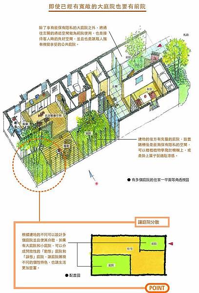 即使是面向道路的庭院也不介意 即使想再住宅的南側設置個完整的庭院,也可能因為建地的面積或形狀而無法實現,因此,根據實際位置設計的結果,很多時候不要偏執於一定要將庭院設計在南邊比較好。 狹窄的建地可以將通往玄關的通道一起做為「前院」使用,如此一來不僅有邀請客人入內的功能,因為面積對馬路還能當作公共空間的庭院使用,不要忘記前院也是街景構成要素之一。 <更多請鎖定> 誠品 購書連結博客來 購書連結金石堂 購書連結書蟲 購書連結